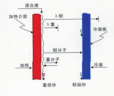 分子蒸餾是一種特殊的液--液分離技術(shù),不同于傳統(tǒng)蒸餾依據(jù)物質(zhì)沸點(diǎn)差分離原理,而是依據(jù)混合物中各物質(zhì)的分子運(yùn)動(dòng)平均自由程差異實(shí)現(xiàn)分離的。根據(jù)分子運(yùn)動(dòng)平均自由程原理如右圖所示,在好的狀態(tài)下讓液體混合物沿加熱板流動(dòng)加熱,輕、重分子就會(huì)逸出液面而進(jìn)入氣相,由于輕、重分子的自由程不同,因此,不同物質(zhì)的分子從液面逸出后移動(dòng)距離不同,若能恰當(dāng)?shù)卦O(shè)置一塊冷凝板,則輕分子達(dá)到冷凝板被冷凝排出,而重分子達(dá)不到冷凝板沿混合液排出。這樣就可以達(dá)到分離物質(zhì)的目的。依據(jù)此原理人們?cè)O(shè)計(jì)了降膜式、離心式、刮膜式等各種蒸發(fā)器,在實(shí)際操作中由于各種條件的限制很難達(dá)到滿意的分子蒸餾分離目的,而各種蒸發(fā)器都有一個(gè)共同的特性就是蒸發(fā)面與冷凝面的距離很短,從蒸發(fā)面溢出的分子到冷凝成液體所經(jīng)歷的行程短所以稱作短程蒸餾器。